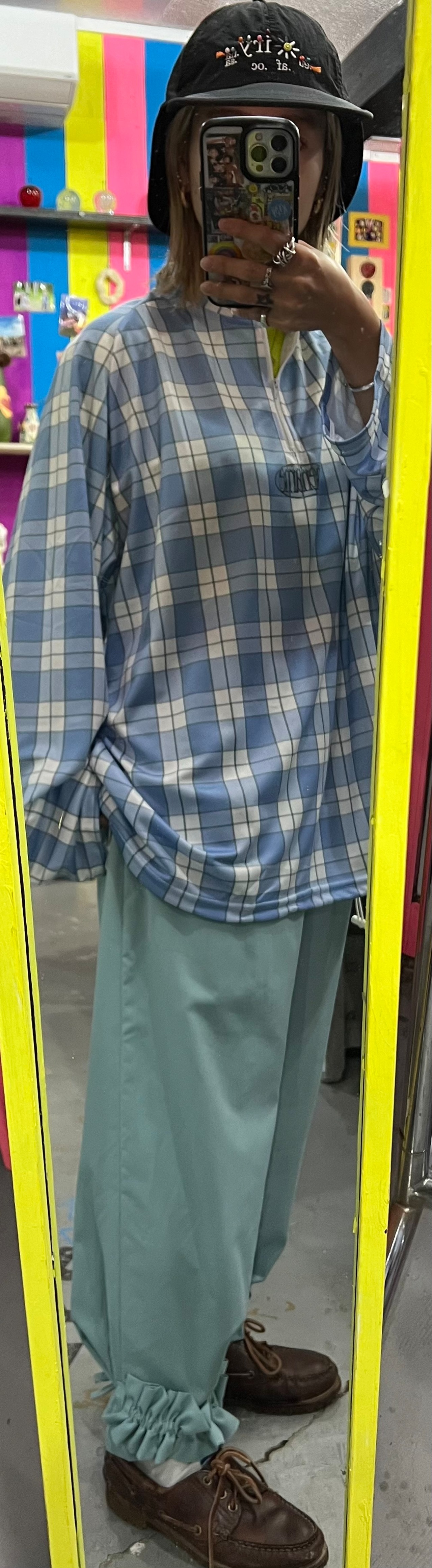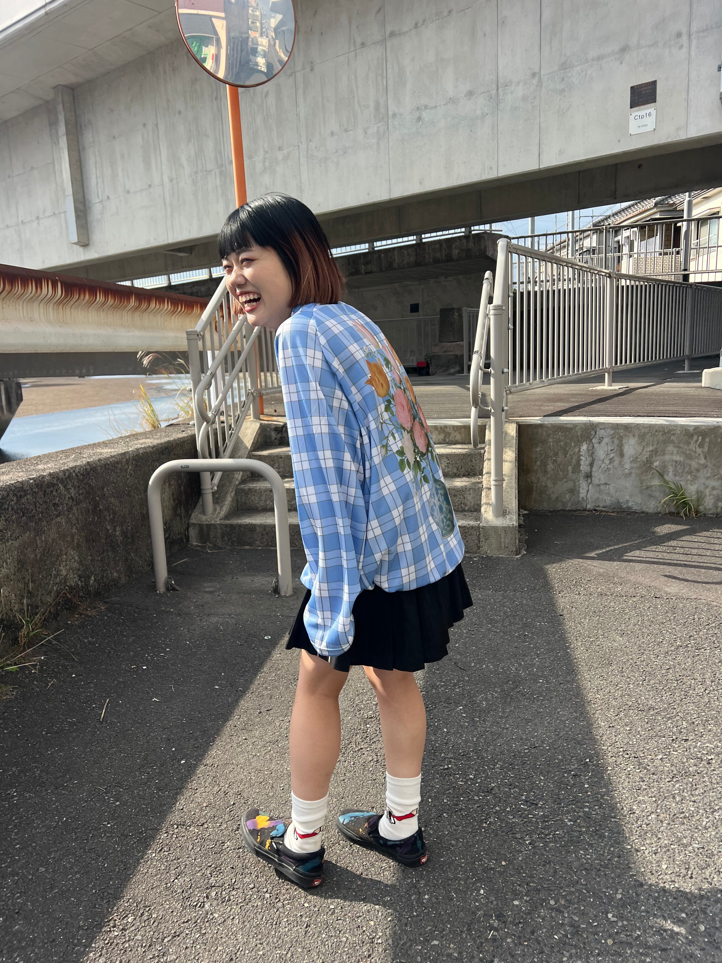このいなたい水色チェックにフラワーベースプリント